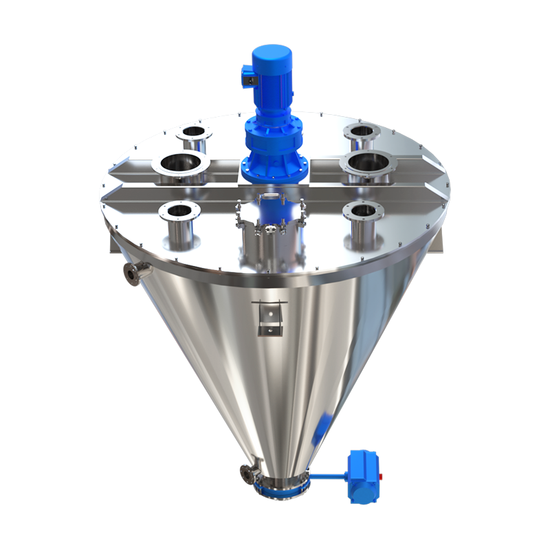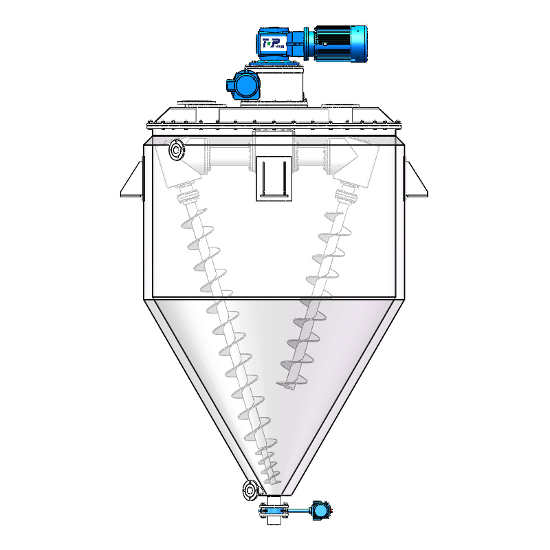 Двухспиральный конический смеситель состоит из трансмиссионной части, шнековой мешалки и перевернутого конического цилиндра. Мешалка представляет собой две асимметричные спирали. Вращаясь вокруг оси, они вращаются вокруг оси и используют вращательное действие вращающегося рычага для совершения революционных движений в конусе. Оборудование многократно поднимает материал через охватываемую часть и самовращение спирали и генерирует сложные движения, такие как сдвиг, конвекция, диффузия и т. д. в конусе, тем самым достигая цели равномерного смешивания.